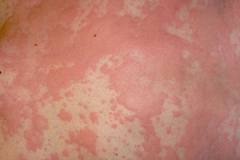 Симптоми: після контакту з алергеном через невеликий проміжок часу виникає подразнення шкіри схоже на опік кропивою (спершу утворюються дрібні прищики, які сильно сверблять, від розчурхів, пришики робляться більшими, зливаються один з одним урворюючи суцільний набряк червоного кольору, зникає без видимих залишкових явищ на шкірі