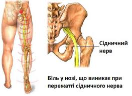 Симптоми: біль в ділянці сідниць, задньої поверхні стегна, задньої поверхні гомілки і тильно-зовнішньої поверхні стопи, посередині задньої поверхні стегна, в підколінній ямці, обмеження згинальної здатності хребта через біль в задній поверхні стегна, зниження чутливості по зовнішній поверхні гомілки.