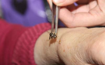 1.Бджолина отрута (апітоксин) має виражену протизапальну, знеболюючу, протинабрякову дію, покращує мікроциркуляцію. Вводиться апітоксин у вигляді природніх бджоловжалювань у біологічно активні точки та в точки навколо хворого суглобу. У своїй практиці ми побачили ефективність апітерапії при під*єднанні в схему лікування точок в зоні наднирників, оскільки таким чином ми активніше стимулюємо виділення своїх власних глюкокортикоїдів (гормонів наднирників, які мають протизапальну дію). Курс становить 10-20 сеансів, спочатку через день, надалі 1 раз на тиждень.